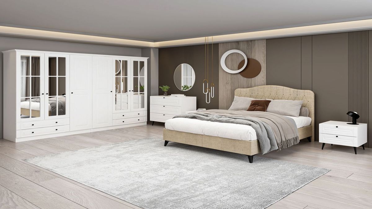 • Gardırop, baza, başlık ve komodin içeren komple takımlar
